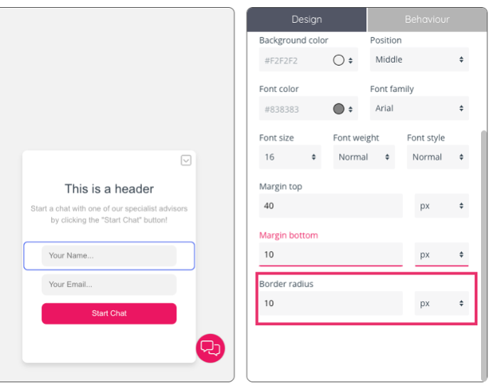 For input fields, there is also an option to configure the border radius by inserting a numerical value and choosing a measurement from the drop-down menu.