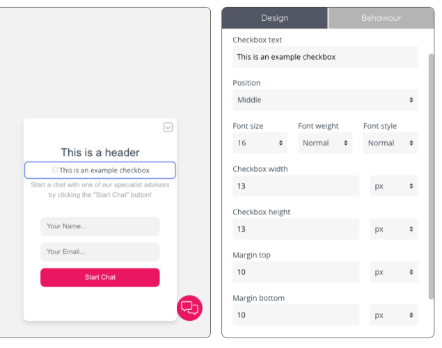To edit a checkbox, you can specify the position, width and height alongside margin settings and customising the font.