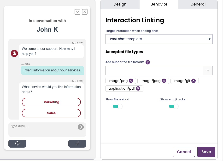 In Puzzel Administration / Services / Chat (new) it is possible to administer settings for file upload.