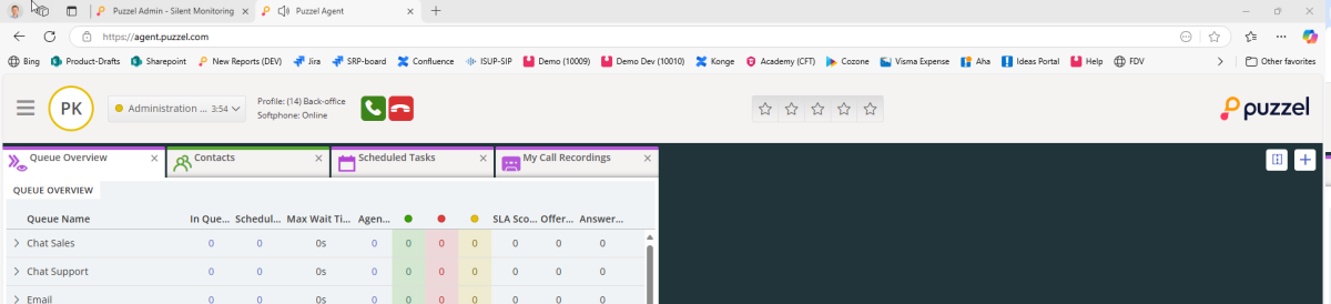 If the listener is your own Puzzel Softphone or another user's softphone, the listener’s Softphone (in Puzzel agent application) must be logged on to queue (with any profile containing Phone) to receive the listen in call. We recommend that the listener is in a (yellow) pause state (e.g. Admin) or is logged on with a (Back-office) profile not containing inbound queues while waiting for a listen in call.