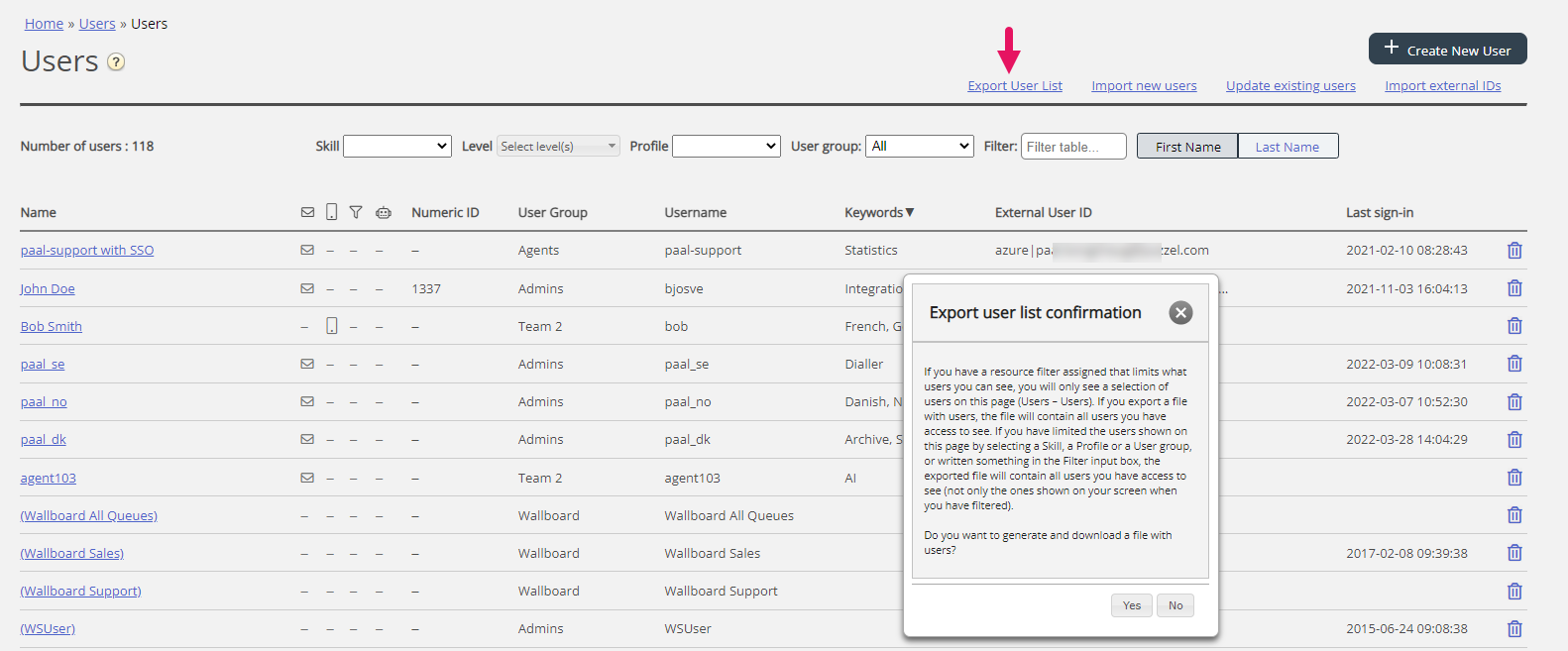 If you have a resource filter assigned that limits what users you can see, you will only see a selection of users on this page. If you export a file with users, the file will contain all users you have access to see. If you have limited the users shown on this page by selecting a Skill, a Profile or a User group, or written something in the Filter input box, the exported file will contain all users you have access to see (not only the ones shown on your screen when you have filtered).