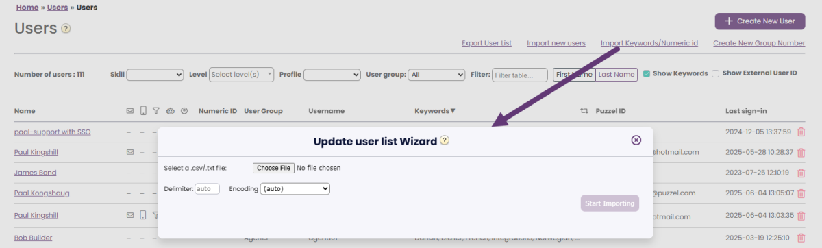 If you want to add Keywords (and/or Numeric ID) to all or many of your Contact Centre users, or update existing Keywords (or Numeric IDs) on several users, you can upload a file with the relevant users' Keywords (and/or Numeric IDs) instead of editing one user at a time.