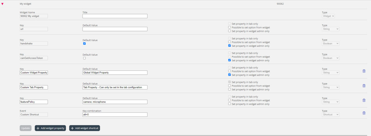 - Set property in widget admin only disables the possibility to change the key value from Widget Configuration. The key value can only be changed from Widget Administration.