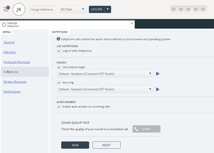 With Softphone enabled, you can choose between logging on with a phone number or Softphone, in the Softphone section in the Settings tab. In addition, you can define which devices to ring on when receiving Softphone calls. In addition to ringing on your headset, you may want to activate ringing on your PC speakers (in case you are not wearing your headset).