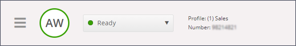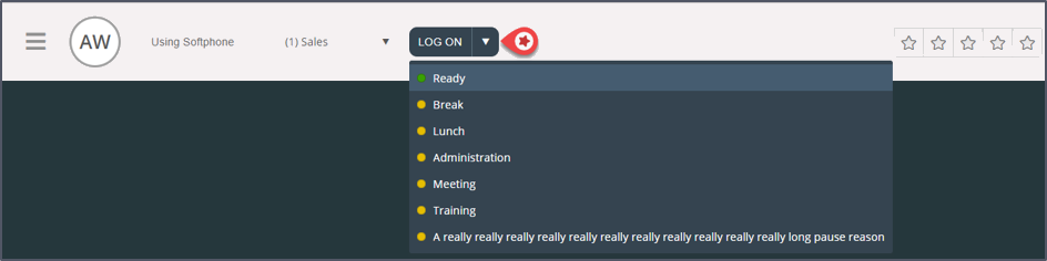 Logging on to queues is done in the status bar at the top of the application. Depending on the features your solution is set up with, you can log on with either a phone number or with Softphone. You can log in directly in "Ready" status or directly to Pause. If your solution is set up with Pause reasons, you can choose among them.