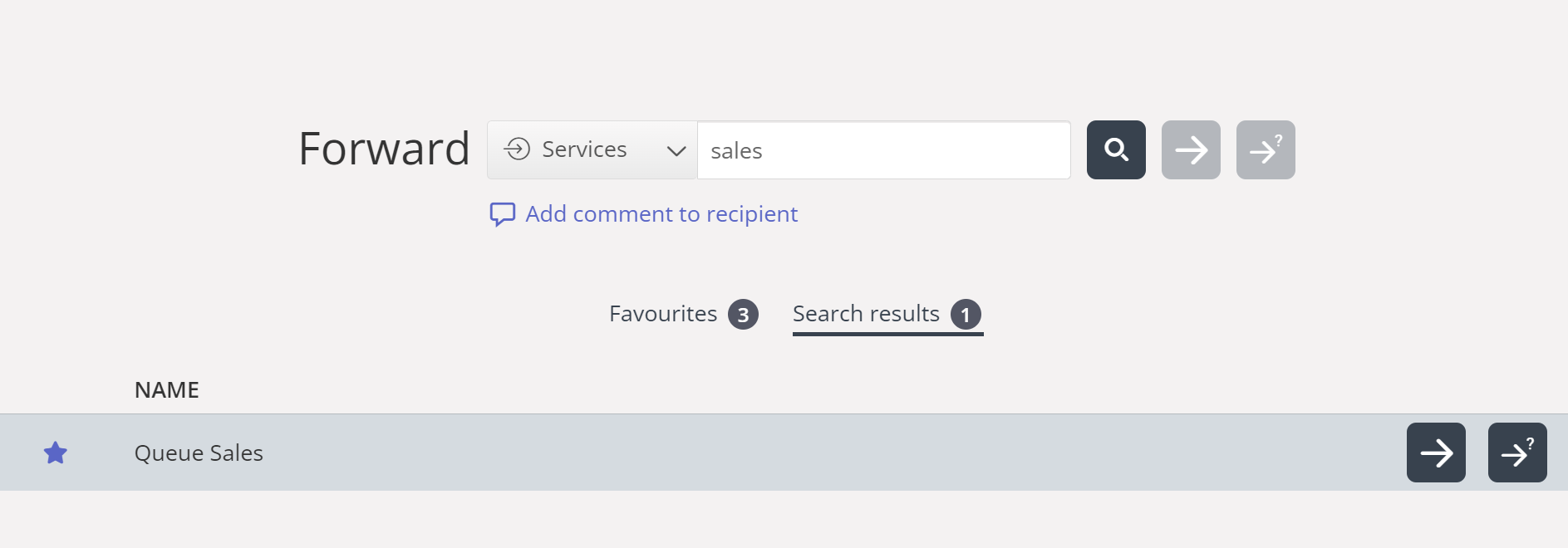 When on a call and searching for a destination to forward the call, the agent can add results to their favorites. This applies to both services and contacts in the catalog.