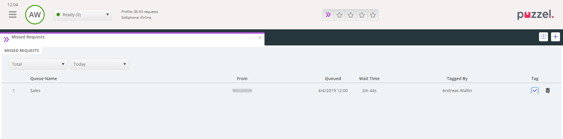 If your Missed request tab is made wide, you will see all columns with information about each missed request, including caller's number, access number, when it was queued, wait time (before caller hung up) and the name of the agent that tagged it, if any. If you don't see all columns, click on a row to expand and see the details for this row, or make the tab wider.
