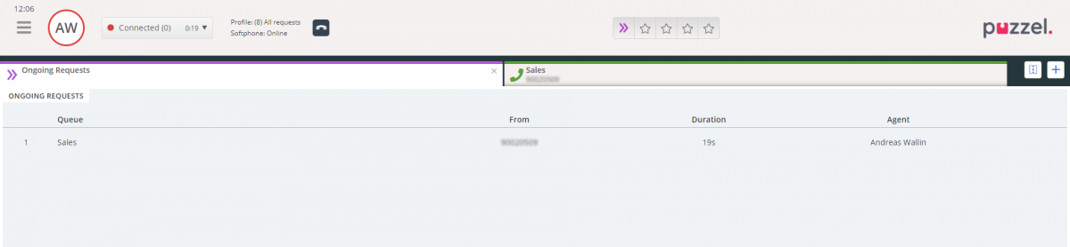 The Ongoing Requests tab gives you an overview of your queue's ongoing requests, meaning requests that agents are currently engaged in.