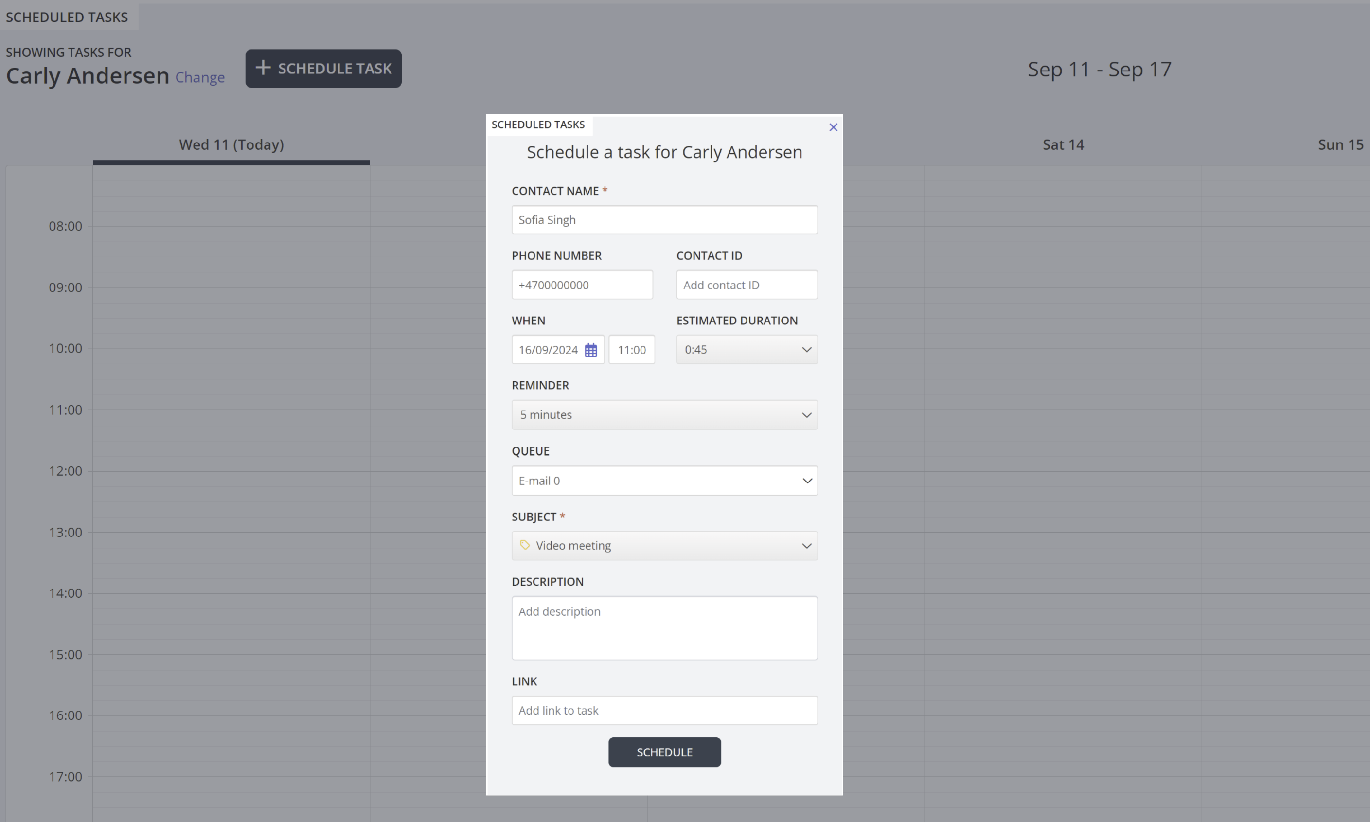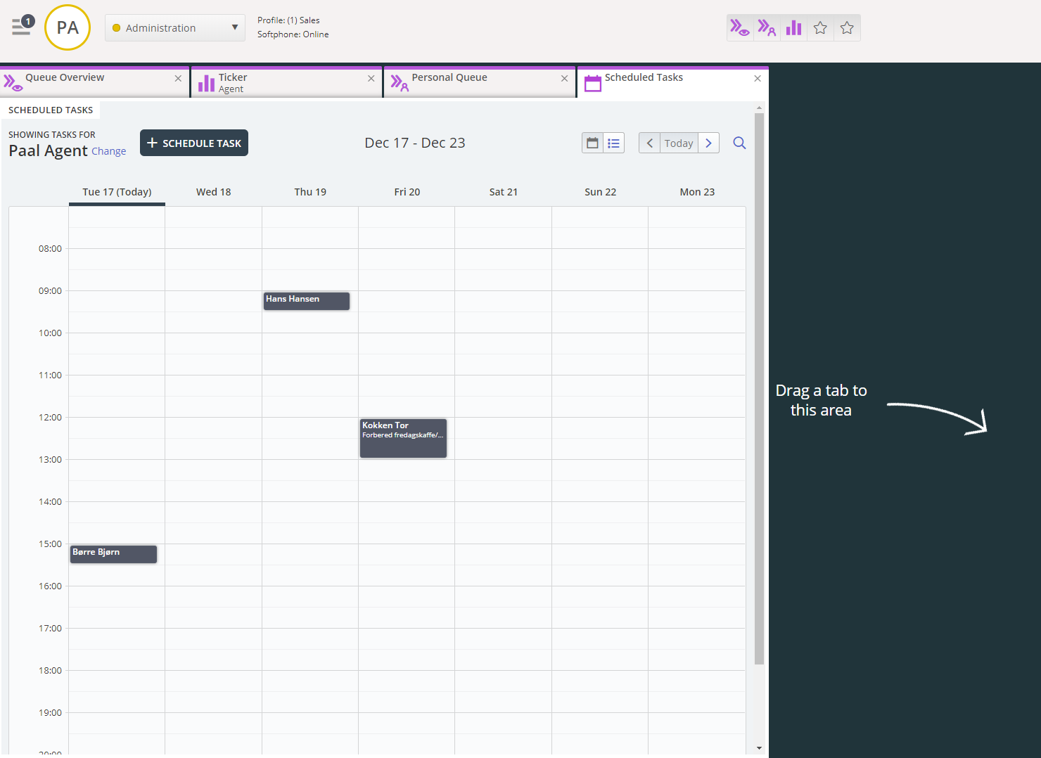 Scheduled tasks tab provides a comprehensive scheduling functionality for assigning tasks to yourself, to other agents or to a queue.