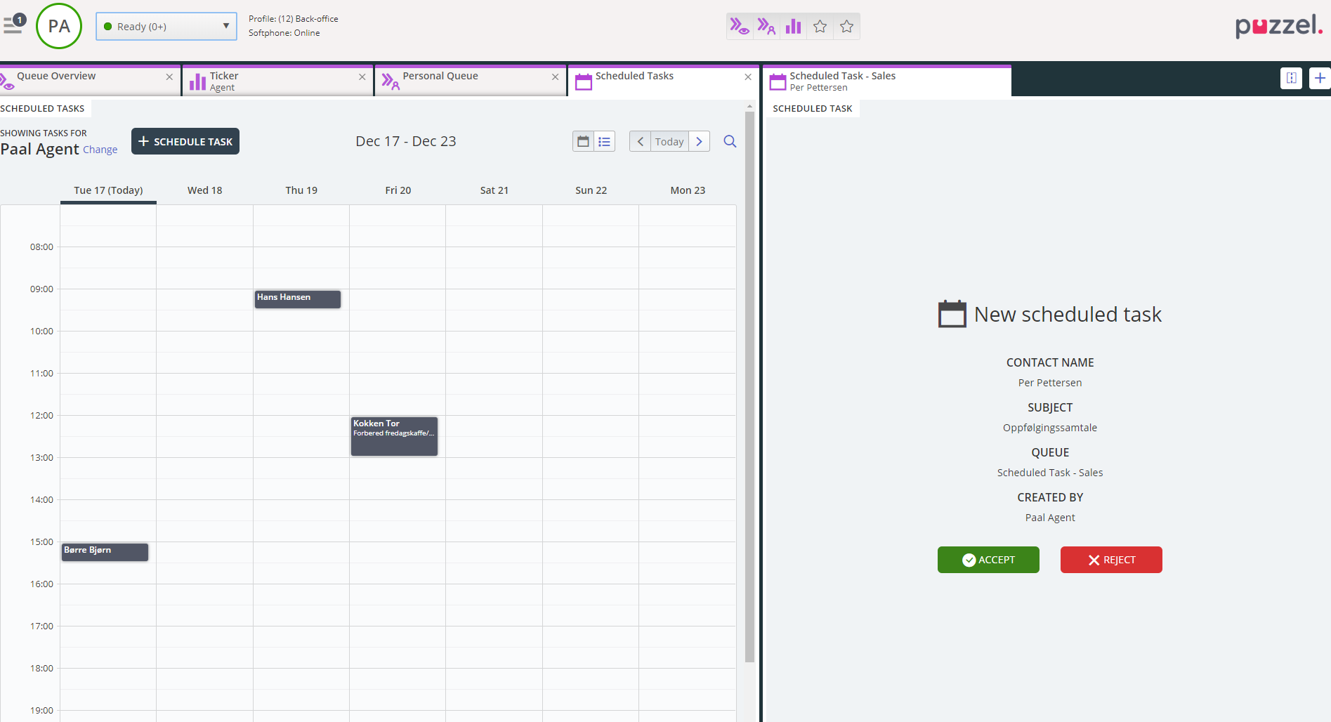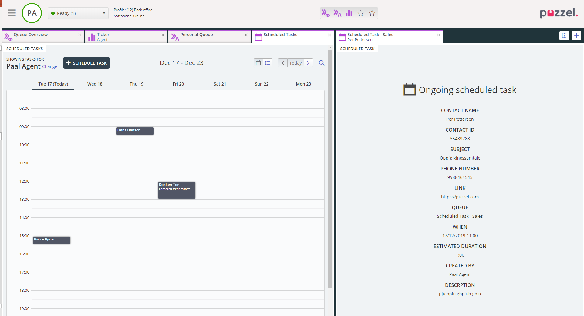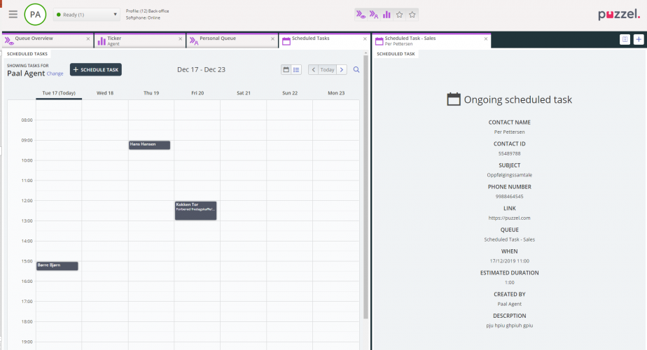 • add/edit/delete scheduled tasks in another agent's Puzzel calendar