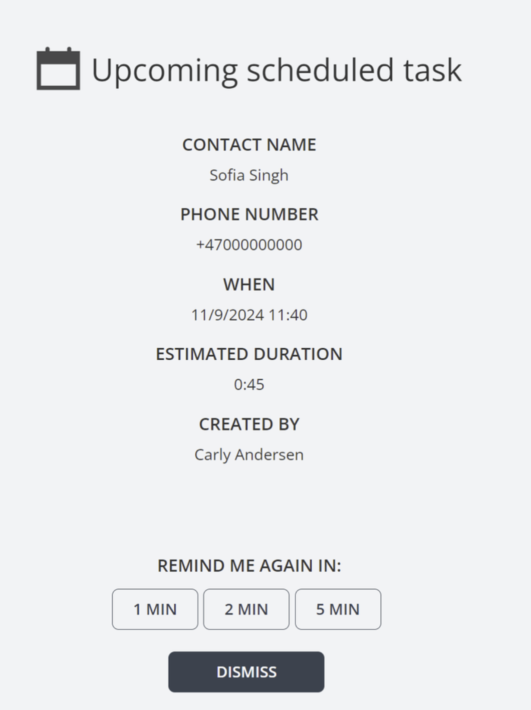• The agent can choose between different reminder times when creating a task