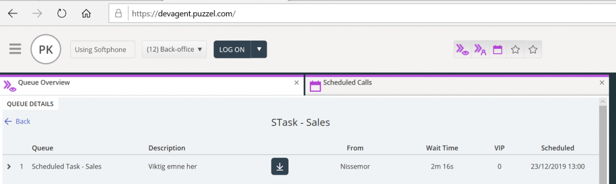 • add/edit/delete scheduled tasks into your Puzzel calendar (max 120 days in the future)