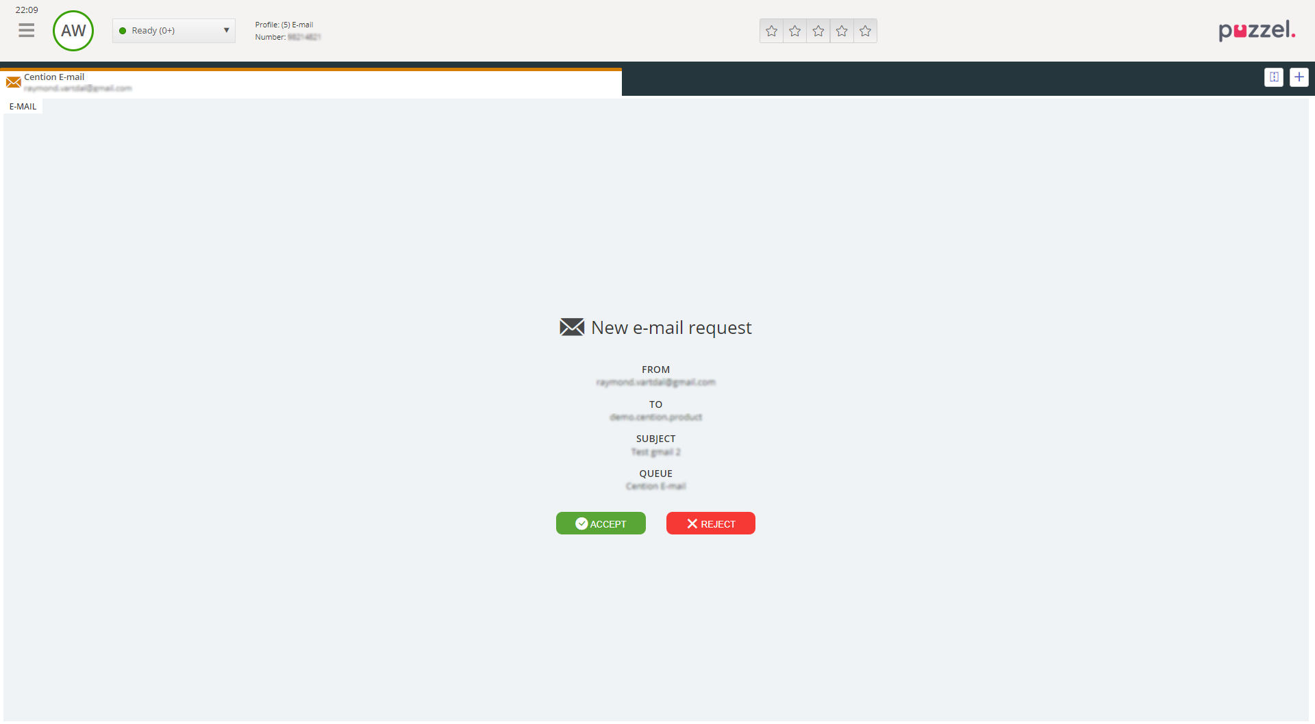 To receive e-mail/e-taskrequests, you must be logged on with a profile that contains the e-mail queue(s). When being offered an e-mail request, it appears in a new tab in your application, and you can choose to accept or reject it.