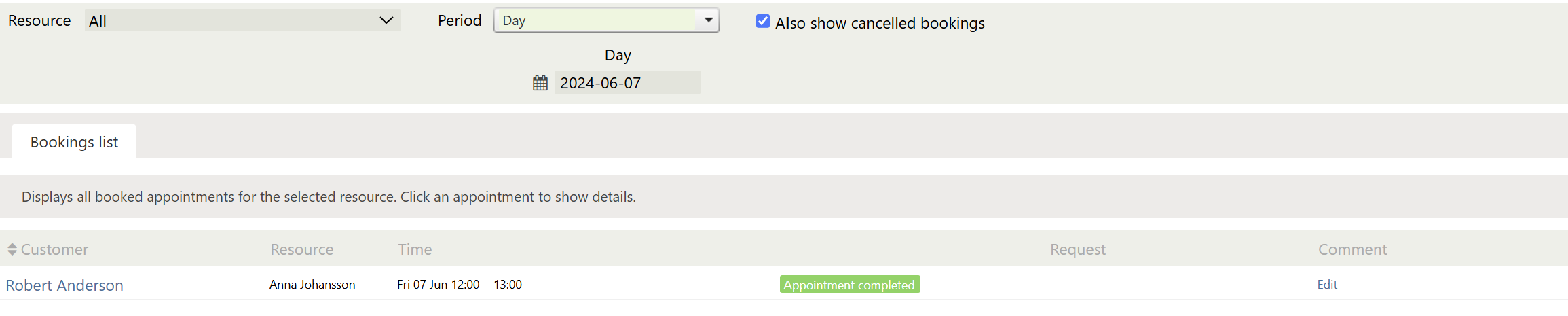 • You can leave comments on a booking. Click Edit under the Comment column, enter your comment, and click Save below the text field.