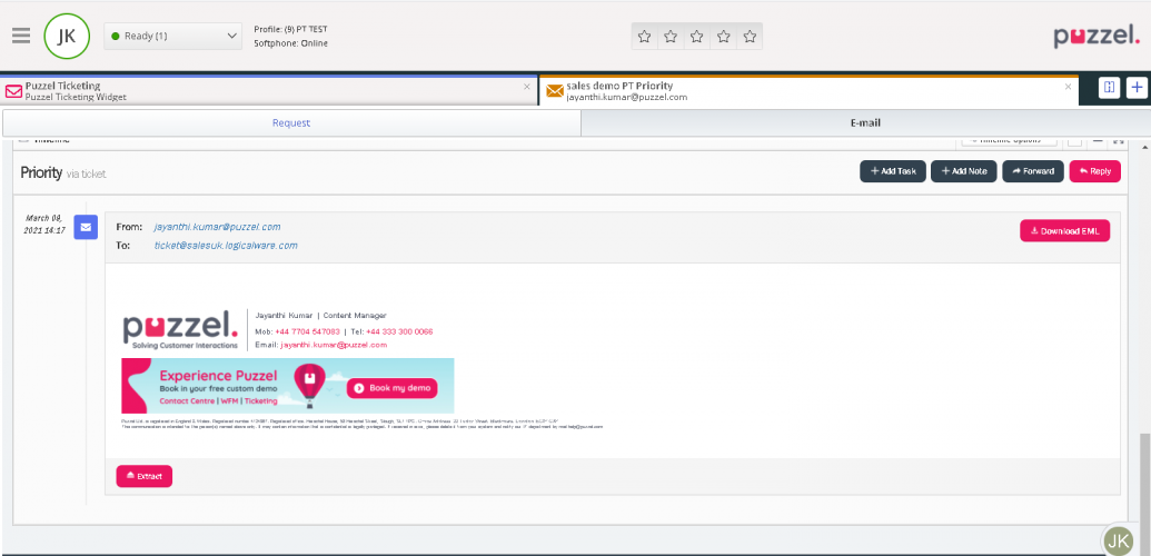 If you have the Puzzel Ticketing widget open, the email notification will be received on a separate tab. Upon accepting the request, you will be able to see ticket details on the same tab.
