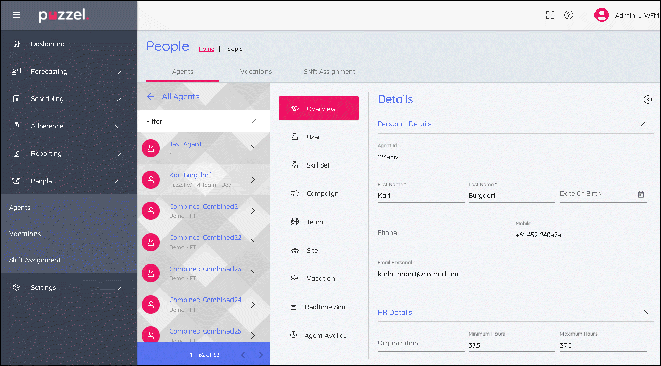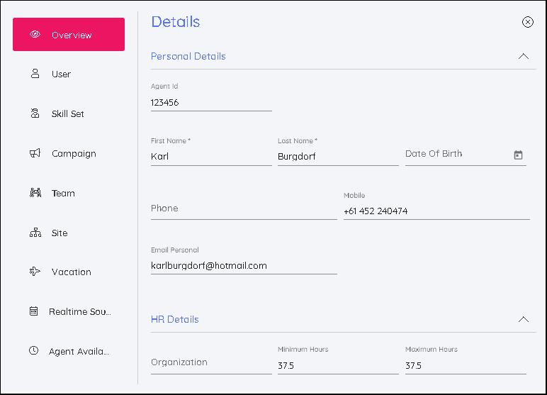 In this section, personal details for the employee can be added or edited. This includes HR & Contract information such as Min/Max hours for how many hours an employee should work each week.