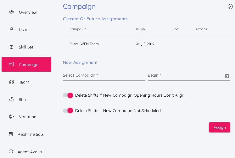 Similar to Skillsets, a Campaign can be back dated or a future effective date can be added. After a new campaign and date have been selected, click Assign for it to become active.