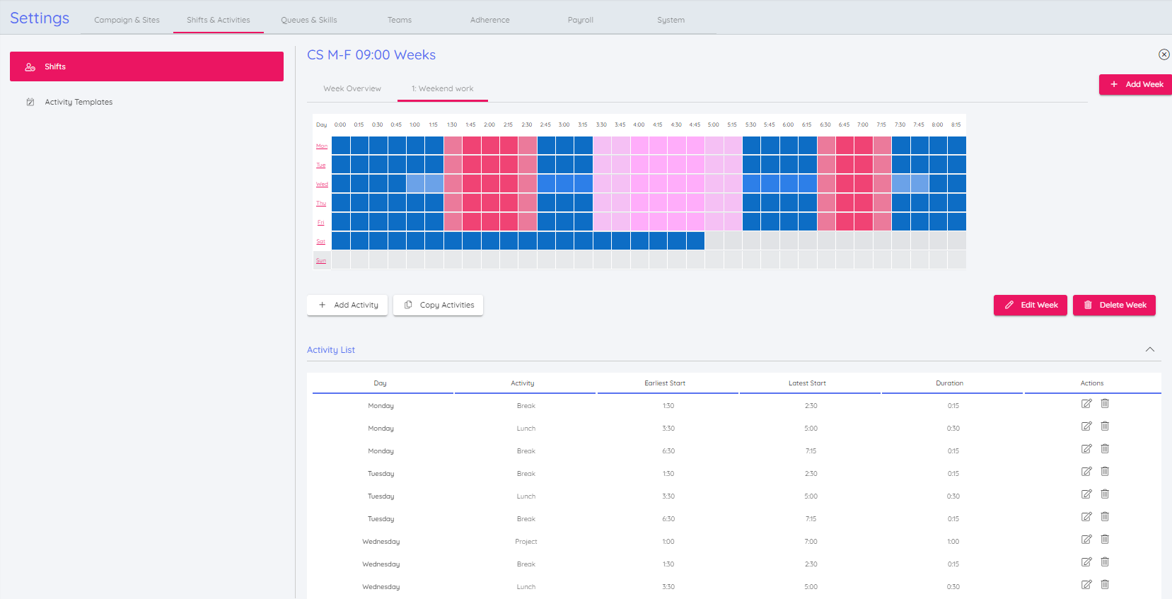 As well as showing the activities in a shift week on the grid, there is now also a list.  The activities can be edited or deleted from the list