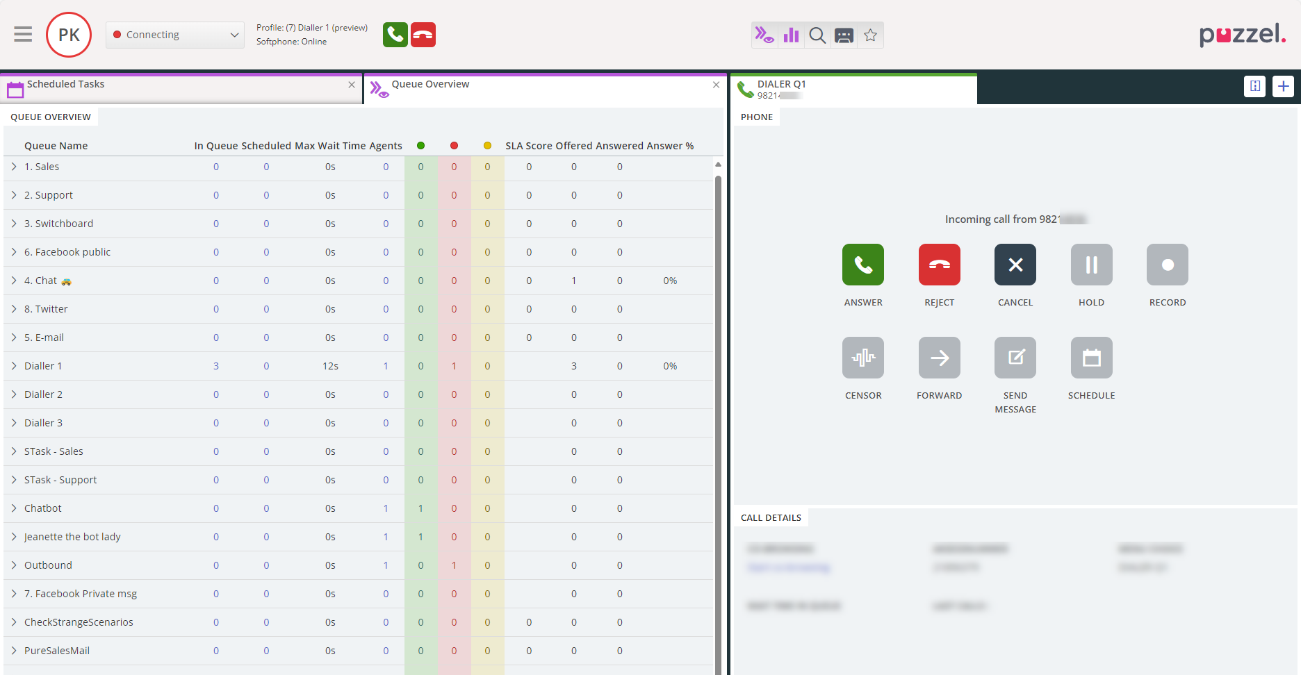 When an agent who is logged on with a profile containing a Preview Dialler queue is offered a call (a contact), the agent can see information about the contact (Name and more) in the Call details part (aka “screenpop” info), and possibly also in another "local" (CRM) system if a Puzzel “CRM pop” is configured.
