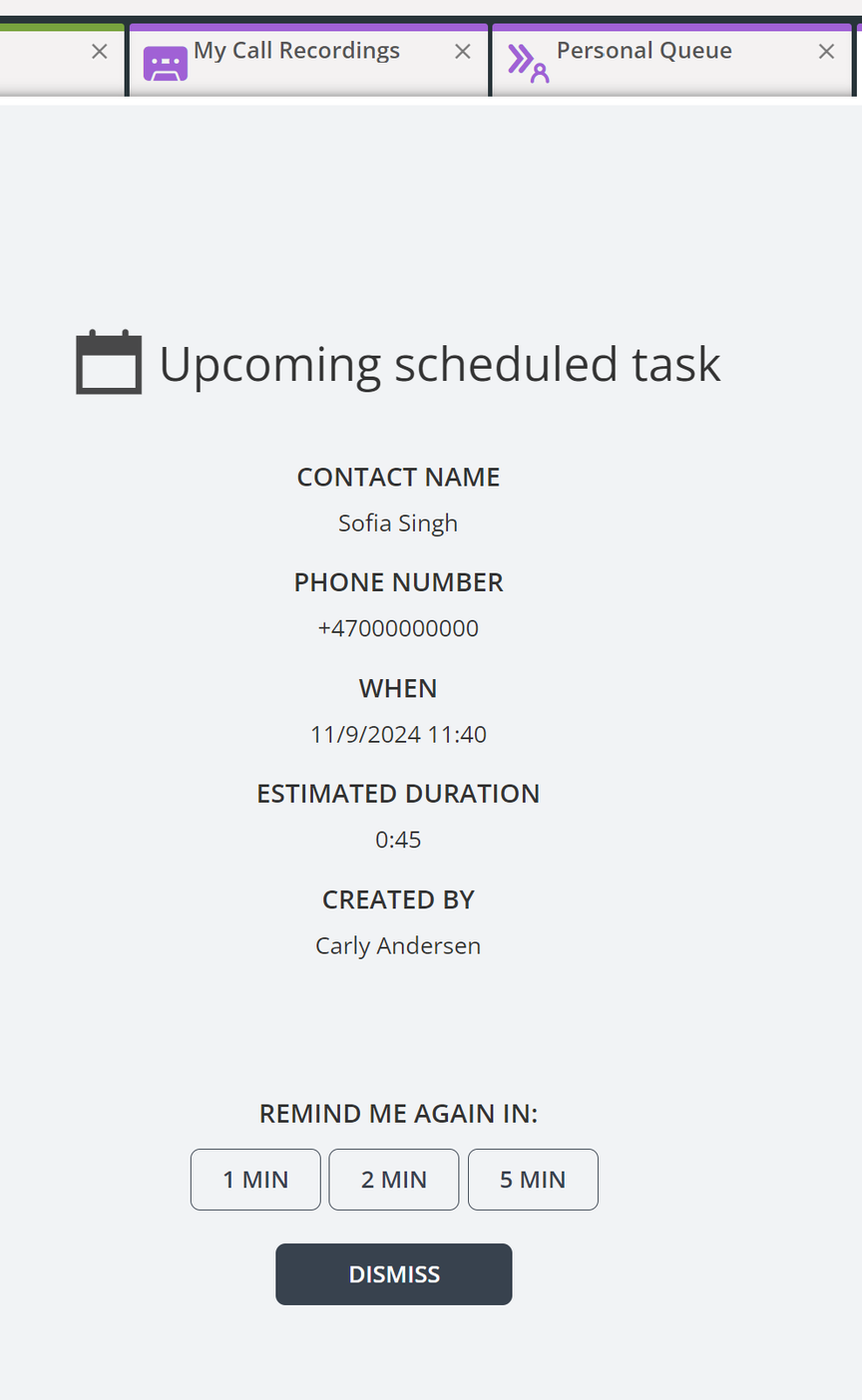 • There is an option to snooze the reminder, enabling agents to postpone it if they are occupied with other tasks.