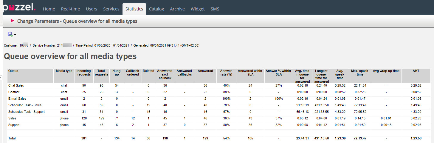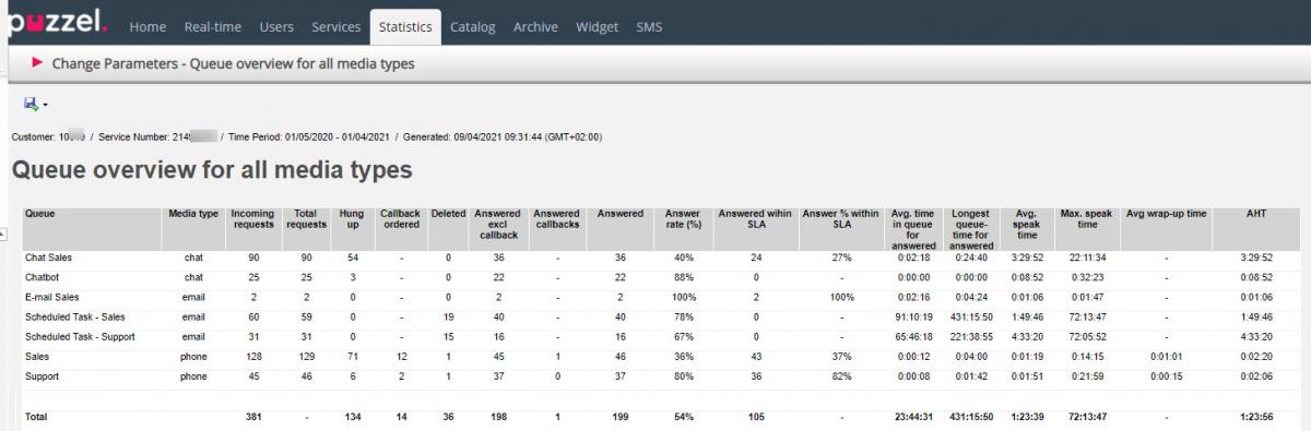 Today we have different statistics reports on queue level for different media types: Details per queue for phone, Details per chat queue and Details per queue for email and social media.