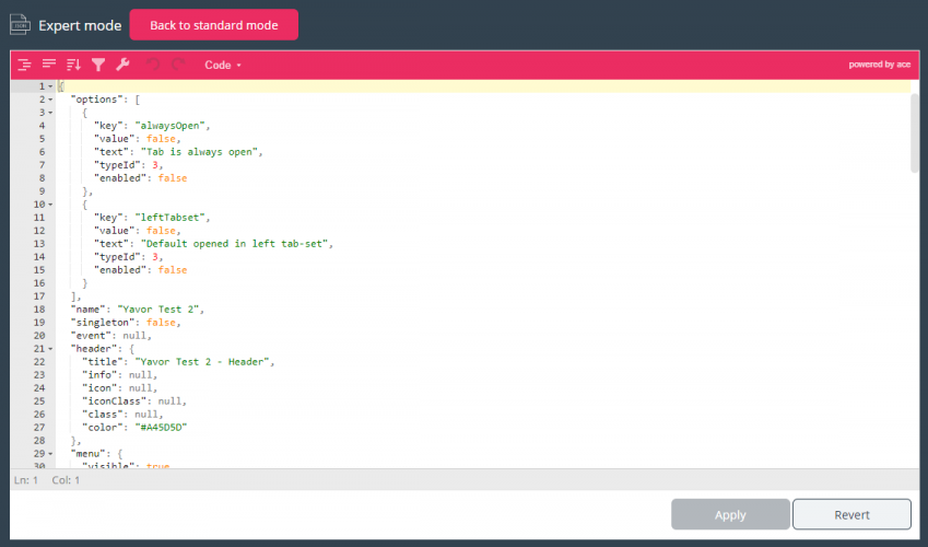 The JSON Editor is a code editor, which allows editing the Tab Configuration, which is in Json Format, directly. This mode is considered an expert mode and should only be used by users, who have deep understanding of the Widget Tab Configuration files, structure and requirements.