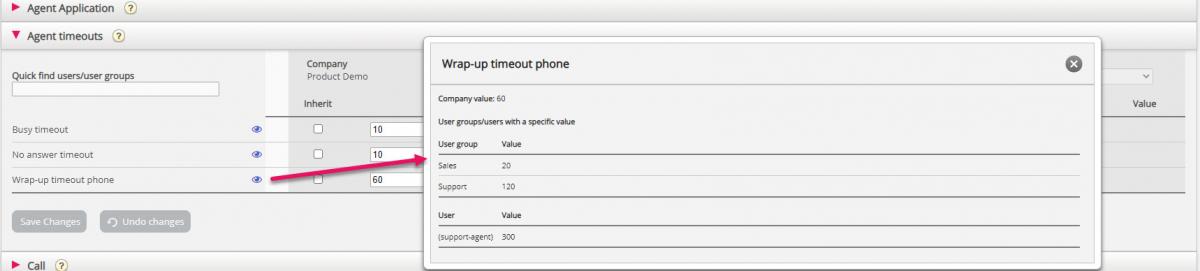 - What are the different wrap-up times defined for different user groups? (click on the icon for this property on page Users – Products – Agent timeouts)