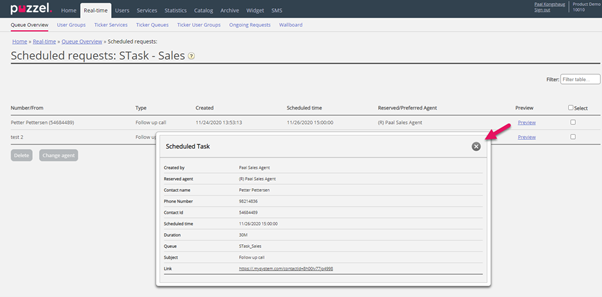 For Scheduled tasks (which use media type email) added by users from agent.puzzel.com (or added using the new API RequestScheduledETaskAdd), we have other input parameters, so when you clicked Preview for a Scheduled task on the Queue details page, we did not show the details. And, on the Scheduled requests page (under Real-time – Queue overview for a selected queue) where a Scheduled task is shown from when it is created until its Scheduled time, we did not have a Preview link.