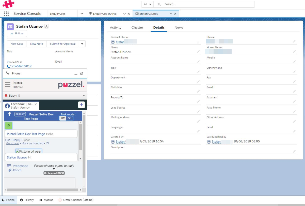 We are now enabling the agents to accept Social Media requests within Salesforce. Agents can now receive requests from all social channels [Facebook,Twitter,Whatsapp and Trust pilot] supported by Puzzel. Lookup of customer records and enquiry logging will work in a similar way as any other channels.
