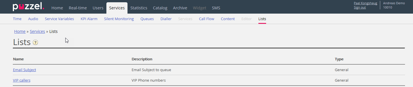 If you are given access to see the page Services – Lists, you will see all your lists expect the ones marked as “visible for Puzzel only” (if any).