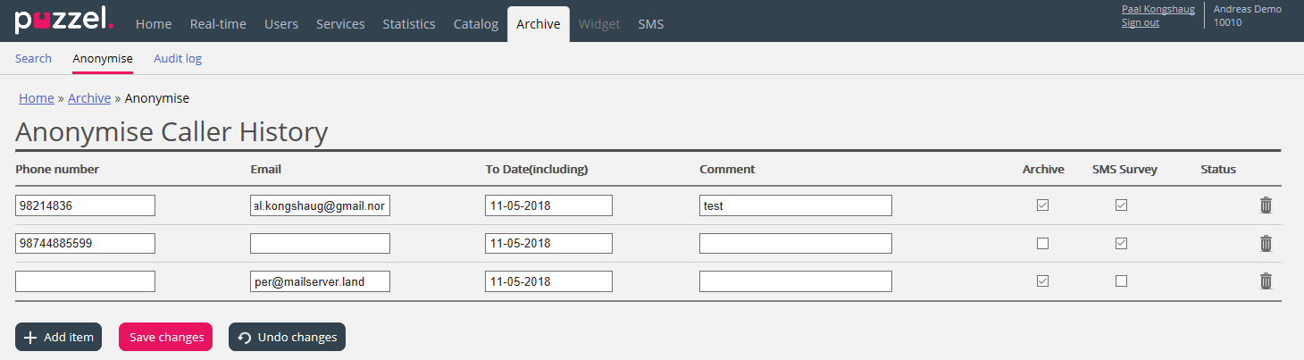 We have now made a new page called Anonymize under Archive. By default, your company do not have access, but please contact Puzzel if you want some/all of your admins to have access to this new page.