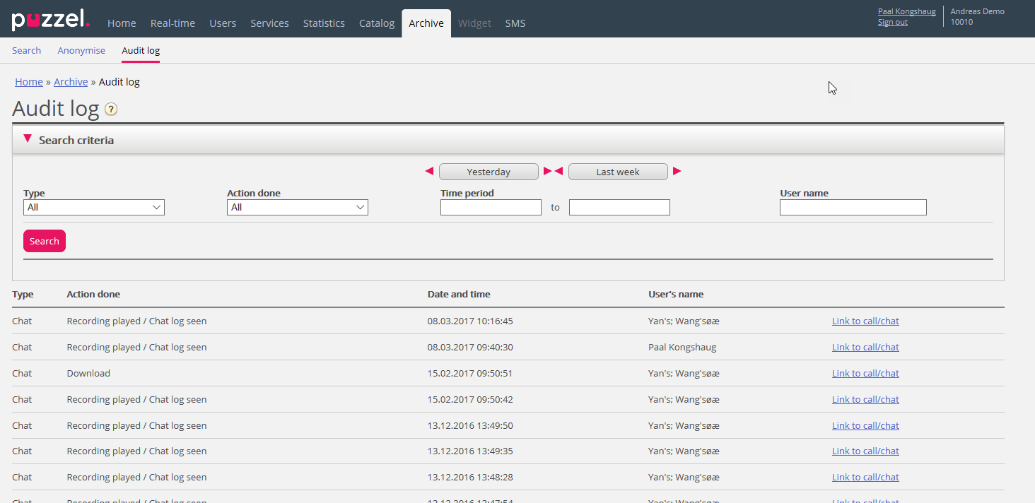 In January 2018 we launched our Archive Audit log, which by default has been off. Only if the Audit logging has been turned on for your Puzzel solution, Puzzel has created a log entry each time a user in the Archive has listened to, downloaded or deleted a call recording or seen/downloaded/ deleted a chatlog.