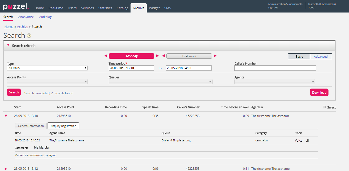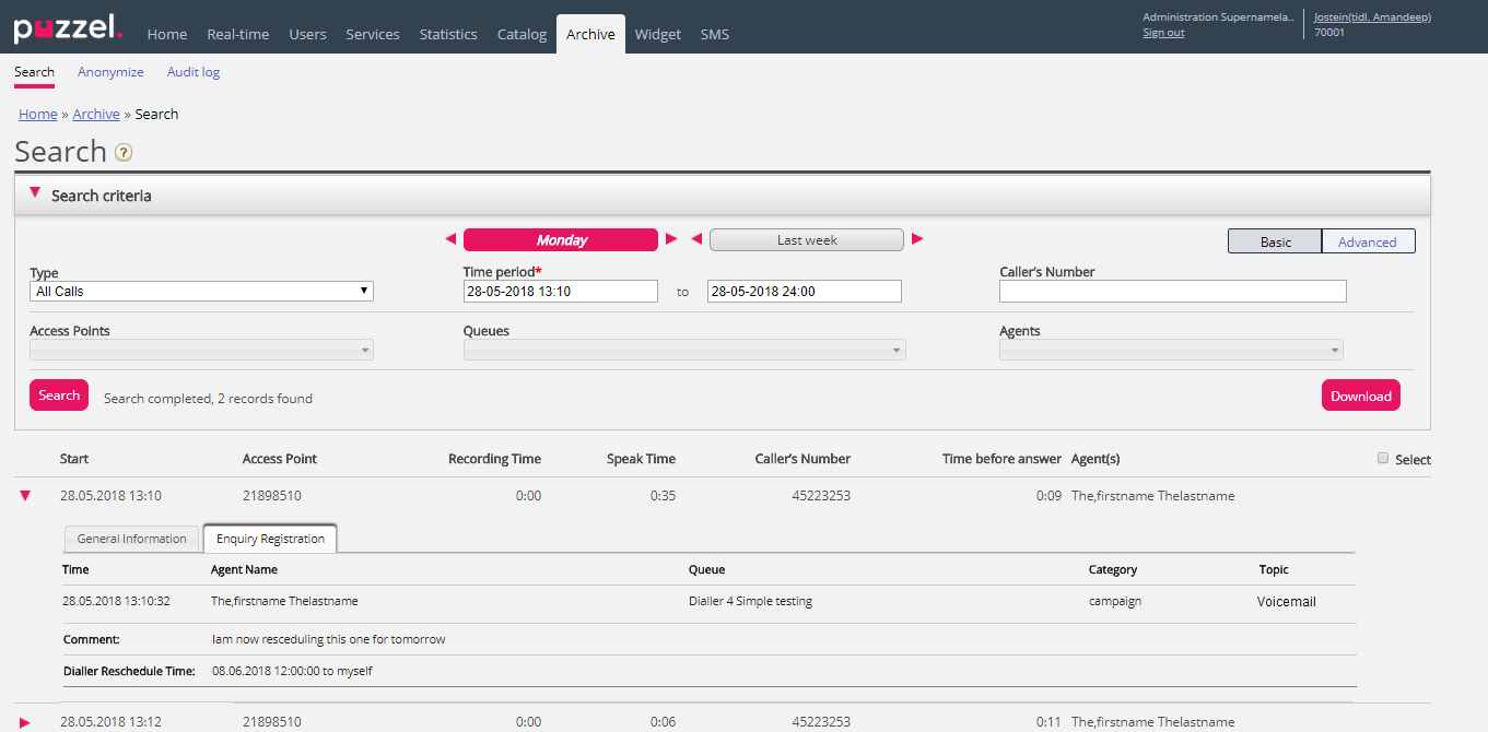 In the Archive, the General information about calls/chats/emails are stored for the agreed number of days (e.g. 360), and call recordings/chat logs may also be stored in the Archive (e.g. for 30 days). The General information contains the caller’s phone number, the chatter’s id/email address and the Email’s sender/From address.