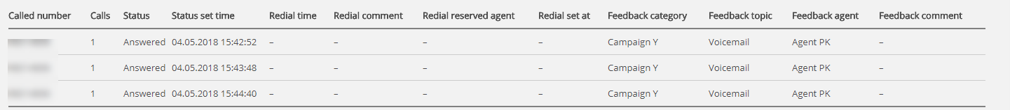 Today’s detailed report for all/selected contacts contains several columns including (Number of) Calls, agent feedback and rescheduling information.