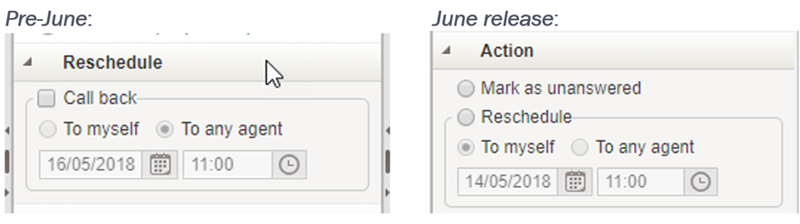 With the June 2018 release, it will be easier for the agent to handle Dialler calls answered by answering machines (voicemail). The Reschedule-part is renamed to Action and extended with a Mark as unanswered option.