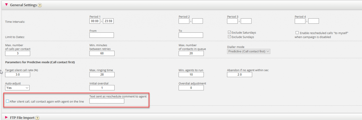 If this new option is turned on (on the Dialler page under accordion General settings), Puzzel will as soon as possible after a silent call happened call the contact again, but this time the Dialler will call an agent first so that an agent is on the line when the contact (or his answering machine) answers the call. If this call to the contact is not answered, the Dialler will not call the contact again.