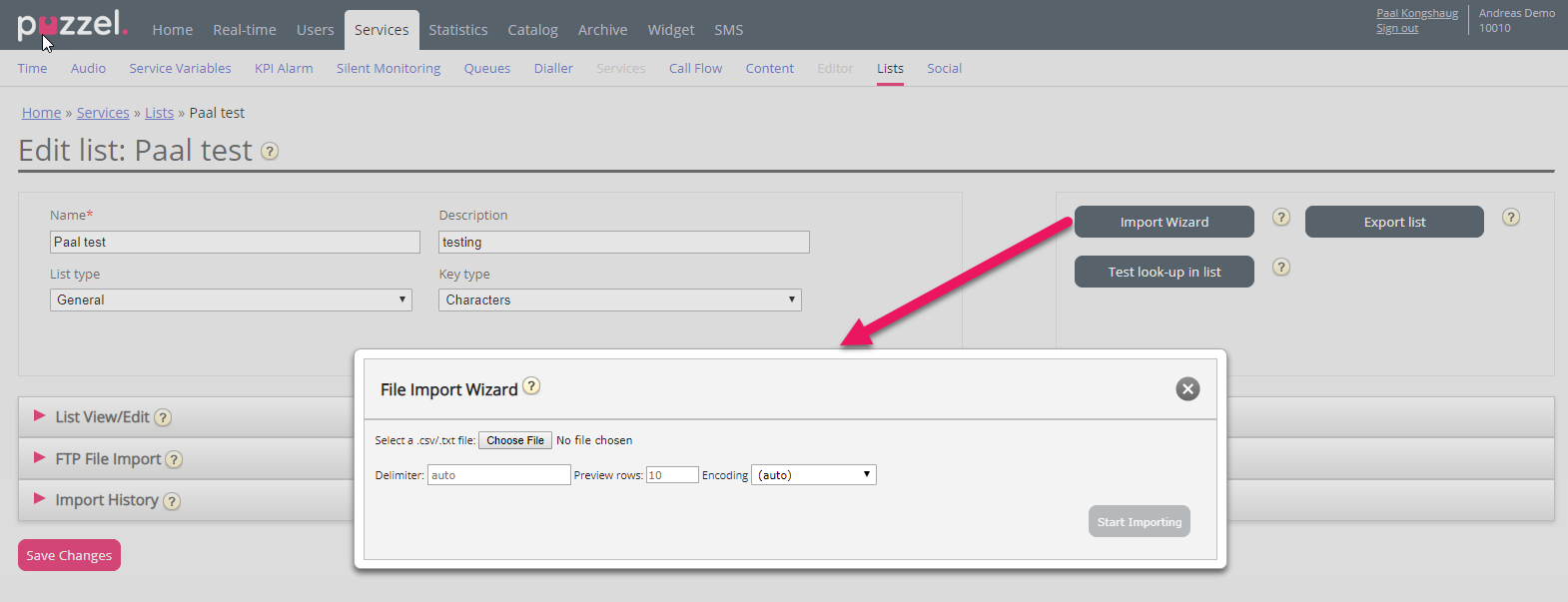 Today a list can be edited by you or by Puzzel support on this page. From June 2019 it is possible to upload a file into the Admin Portal and import it. If you do, this file’s content replaces the current content in the list. If you want to do this, click Import Wizard, select the file on your disk, and choose Start importing.
