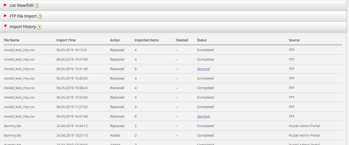 If a file is imported using the Import Wizard or fetched from Puzzel’s FTP server, we will from June 2019 show a record for each import in the new accordion Import History.
