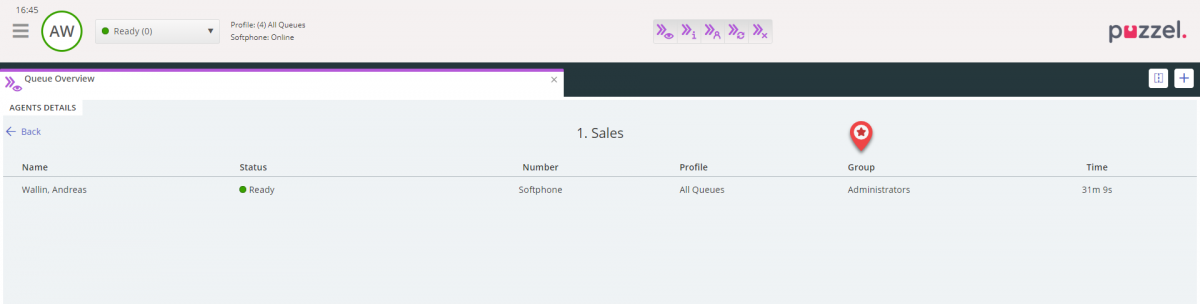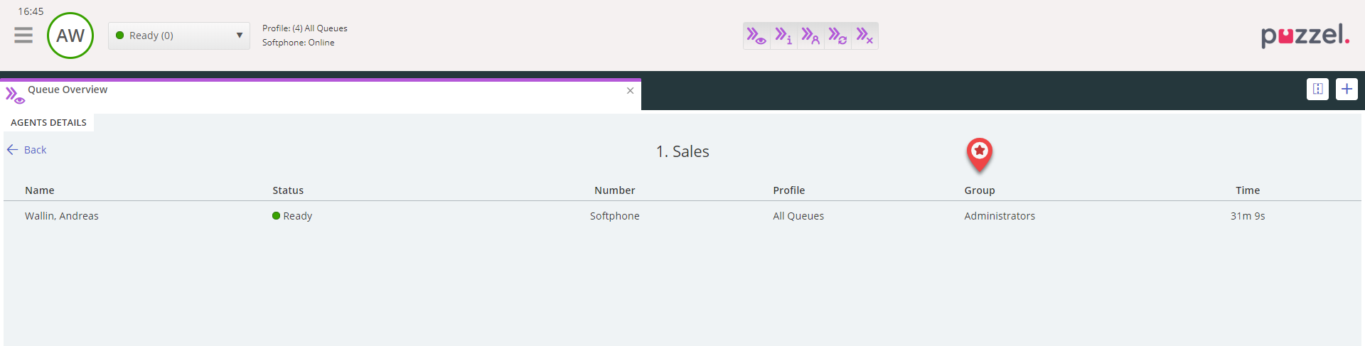 In the agent details view (available when you click on the agent column in the queue overview, we have added a new column called Group. This column shown the user group that the agents belong to.