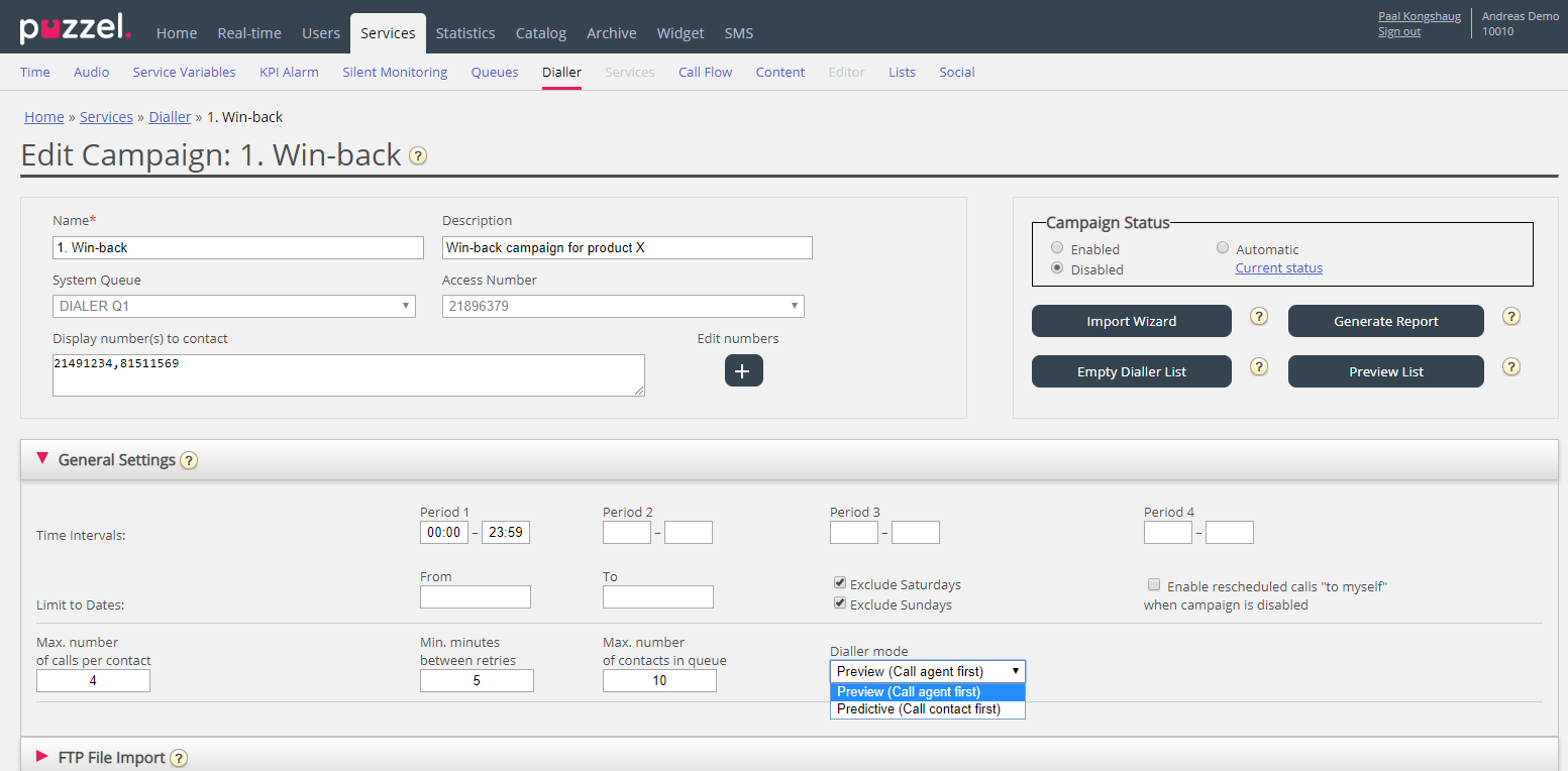 Until now, only Puzzel support has been able to change the Dialler mode from Preview to Predictive or vice versa for Dialler Campaign queues. The reason for not letting customers do it has been to avoid that the mode is changed to Predictive when agents are using an external phone without “auto-answer”.
