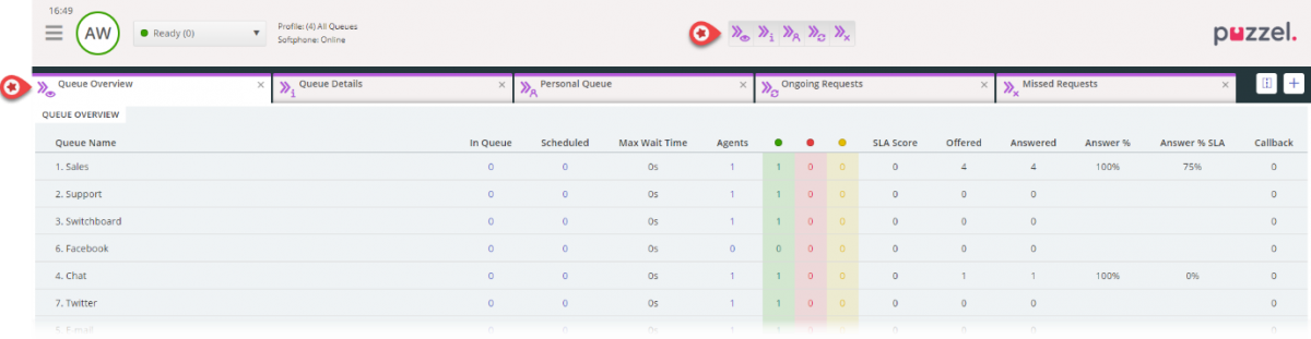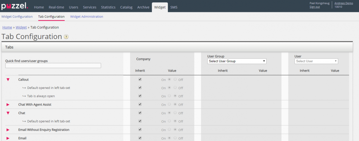 On page Widget – Tab configuration it is defined what tabs (in agent.puzzel.com) that should be available for the Puzzel customer and the different user groups.