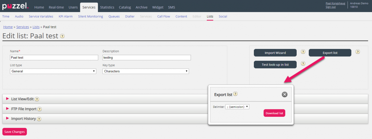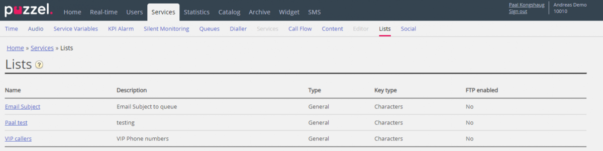 Administrators who have access to page Services – Lists will see some or all lists used in the Puzzel solution. On this page we added 2 new columns (Key type and FTP enabled) to give a better overview.