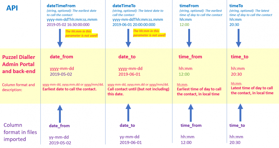 If you use the Dialler API to add contacts to a Dialler list, you can provide information in one or more of the date and time columns to limit when to call the contact.