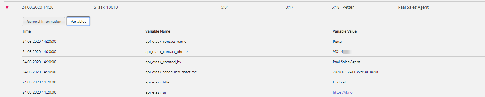 Instead, the task’s Subject and other details are shown in tab Variables. If the agent entered a link/URL when creating the Scheduled task, this URL is shown as one of the variables, and this URL is now clickable.