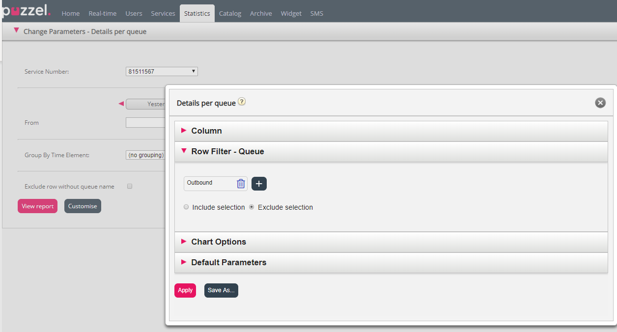 In this example, the Details per queue report is customized to exclude the Outbound queue. When the report is now generated, it will contain all queues except the Outbound queue (unless a resource filter is assigned to the user).