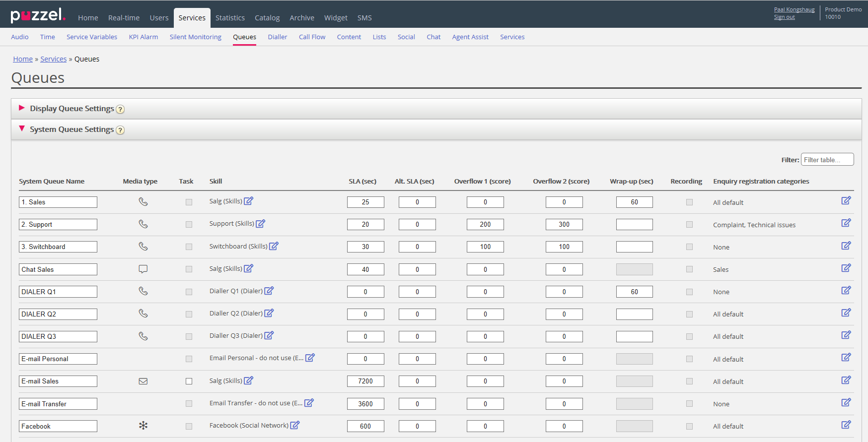 On page Services – Queues under System queue settings, a new column called Media type is introduced. The different media types are: