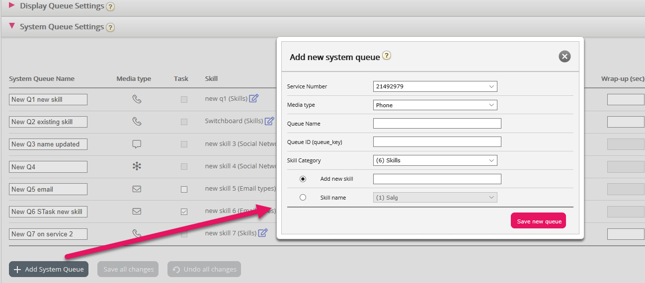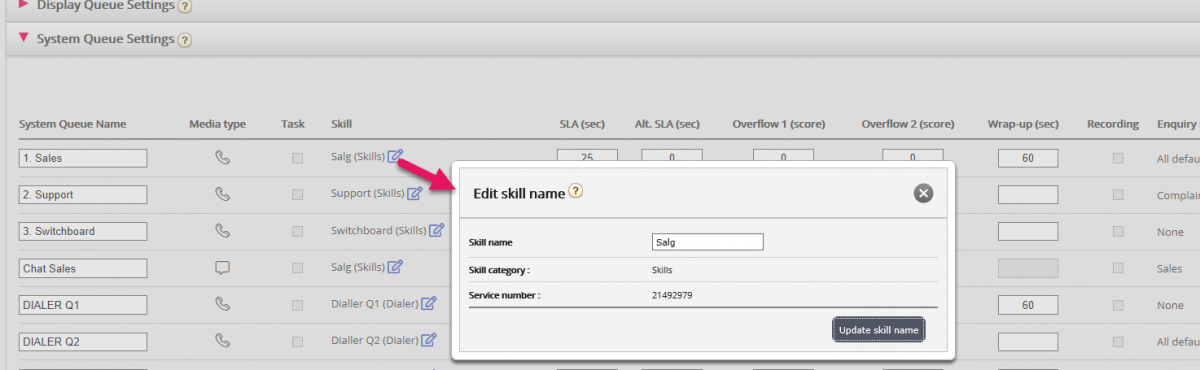 To give you better overview, we now show a new column called Skill under System queue settings. In this column we will show the system queue’s Skill, and the skill’s Category in brackets.