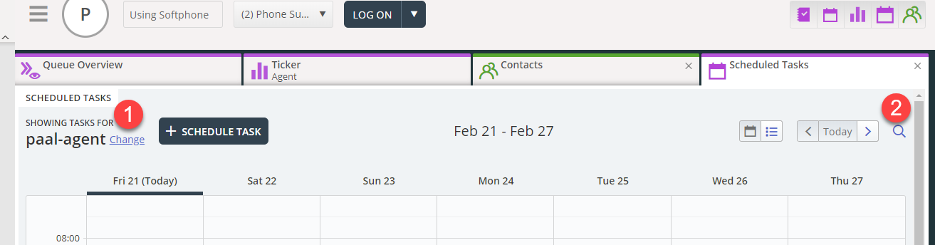 When a user has chosen to see another agent’s calendar (after searching for an Agent or searching for a scheduled task), the user will see all Scheduled tasks in this agent’s calendar. When we are presenting an agent’s calendar for another user, we do not use the user’s resource filter for queues (to limit what scheduled tasks to show), because if we did, we would (often) present an incomplete calendar and cause confusion.
