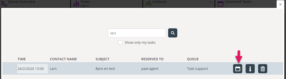 Today, if a user in the Scheduled task (calendar) tab searches for a Scheduled task, the search result includes all Scheduled tasks that matches, in any system queue and reserved to any agent. If the user has a resource filter for user groups or system queues, these filters have not limited what Scheduled tasks that are shown in the result.