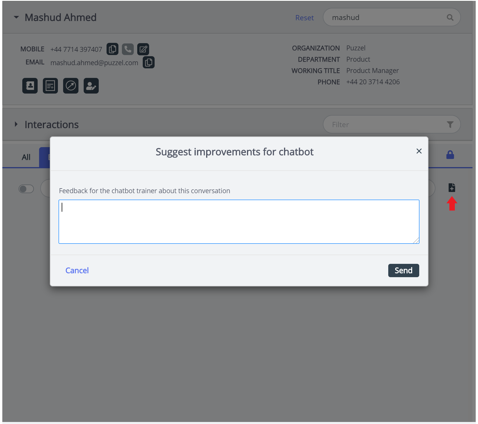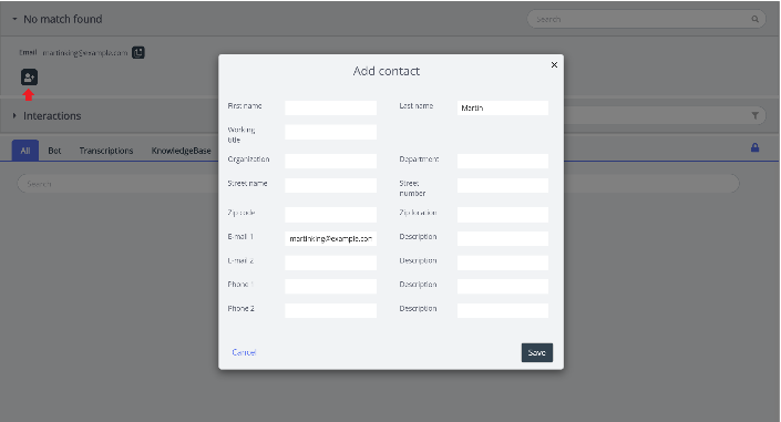 It is now possible to manually search for contacts that may not be on the contact list, however there may be records in Puzzel Media Archive for the phone number or email address in question. Although the contact card does not show any details, the search still manages to display associated calls or emails from the query within the interaction history results. You must search with a full email address or phone number for the manual search in this context.